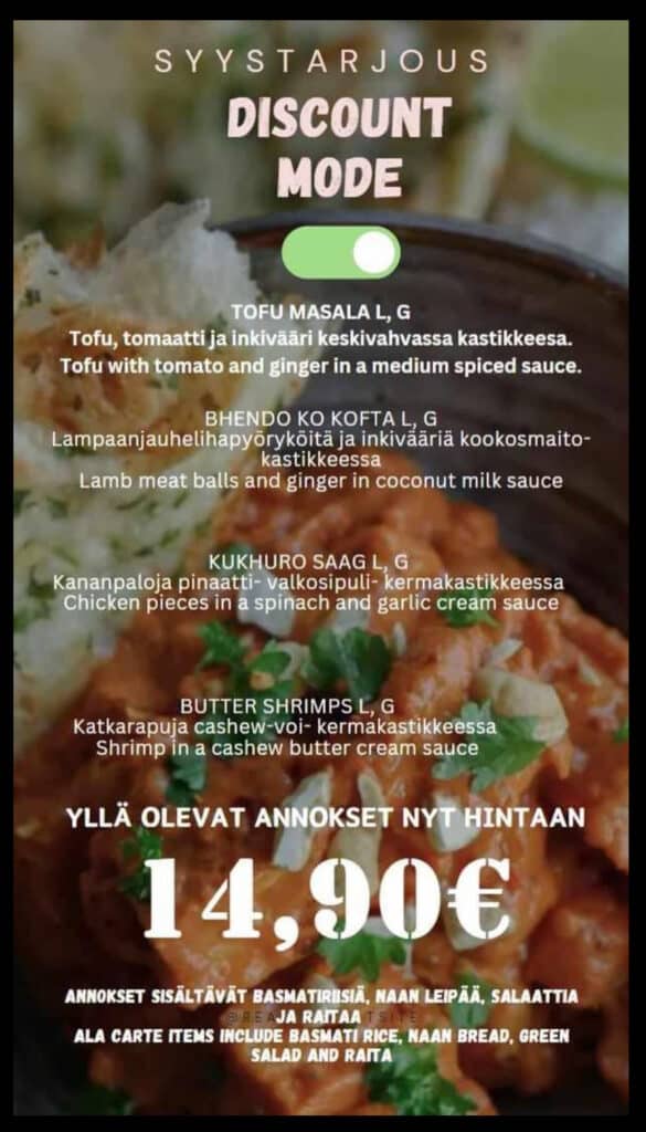 Tervetuloa lounaalle tai valitsemaan alacarte menusta herkullisia ja maukkaita ruokiamme.